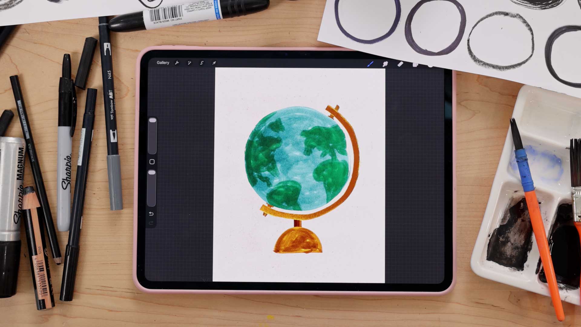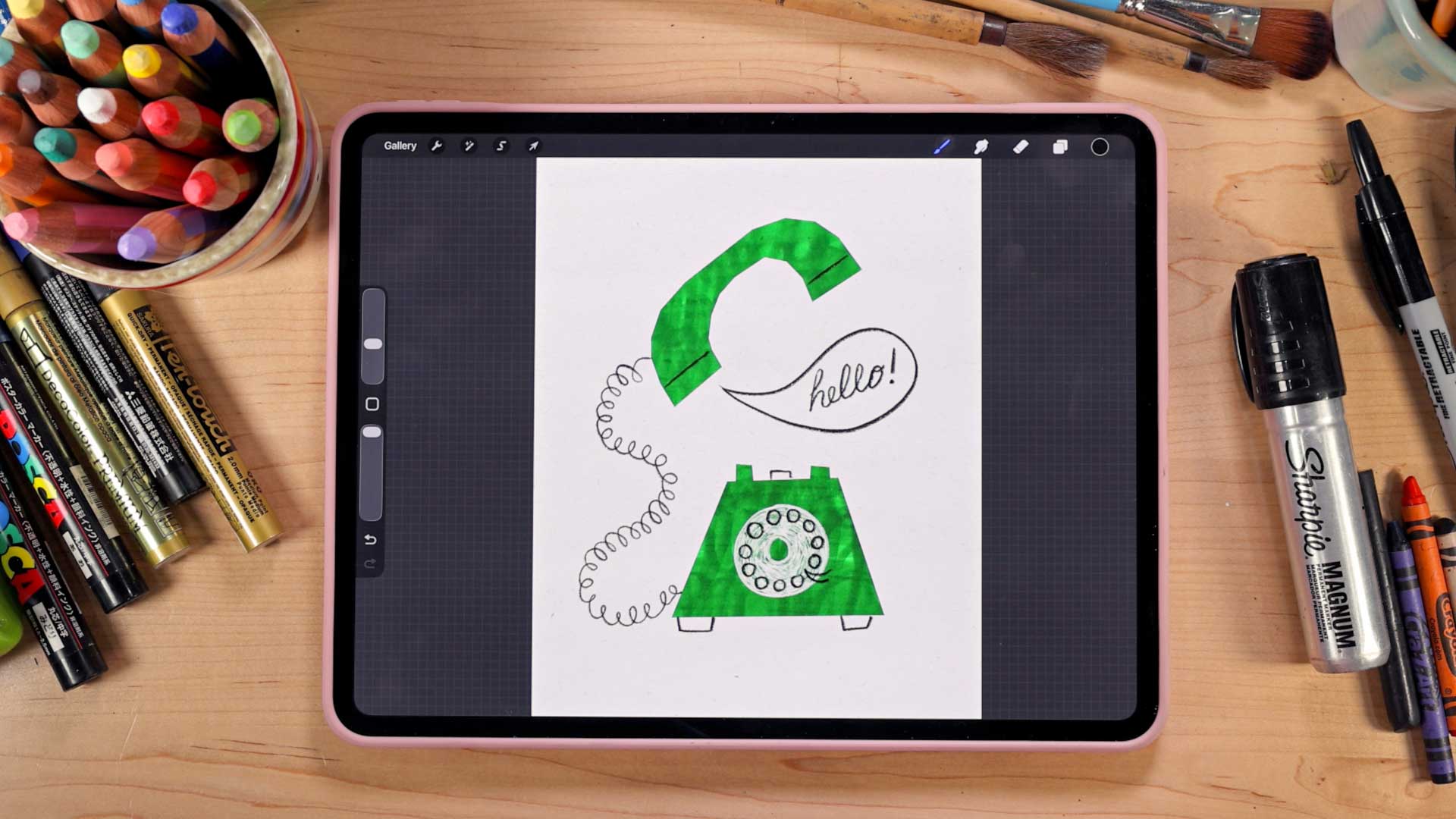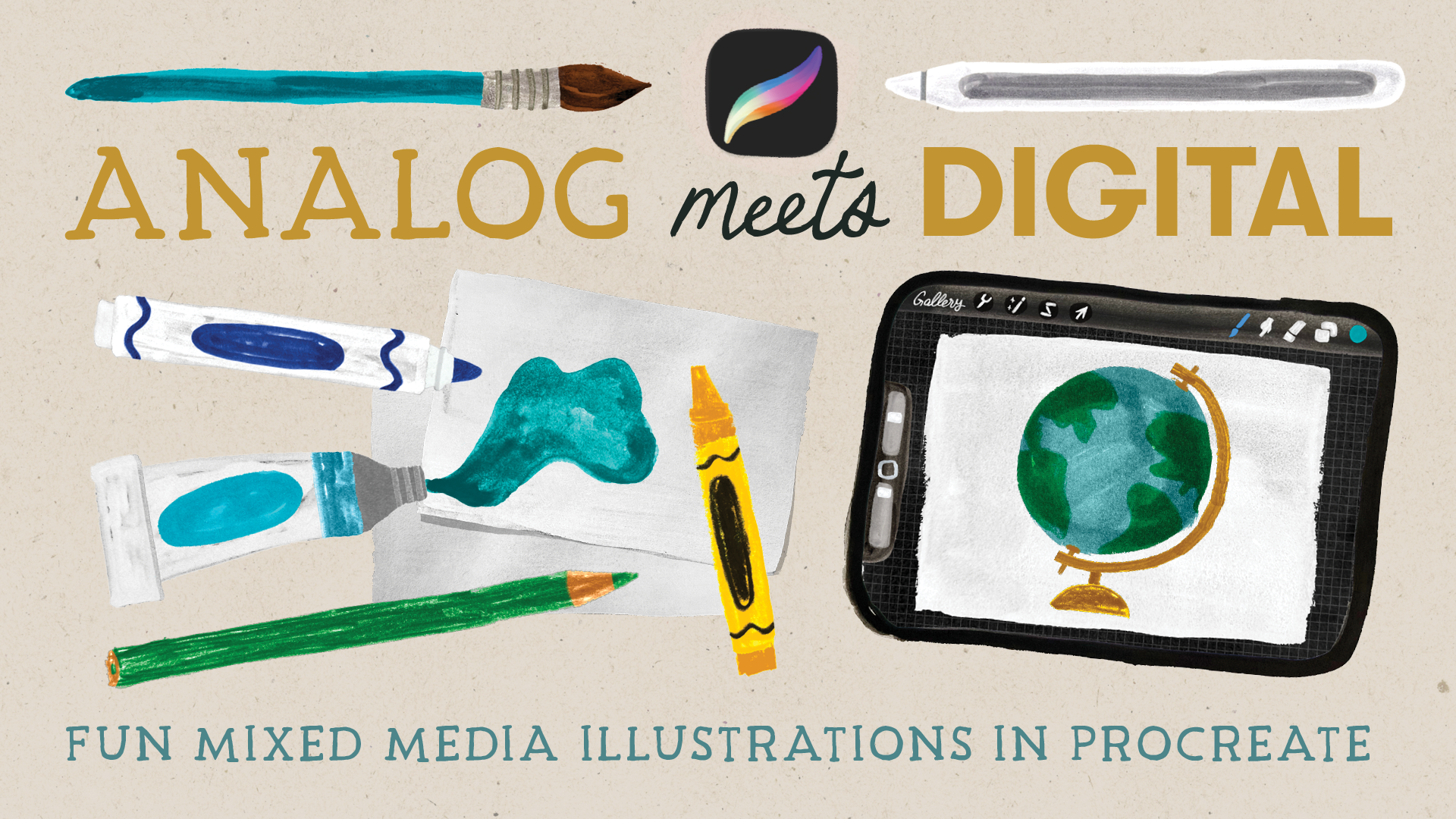 Grab your iPad and whatever art supplies you have lying around, and join me for something a little messy and a lot of fun. In each of the three projects, you’ll start with a quick analog warmup to loosen up, then make textures and shapes by hand before bringing everything into Procreate to layer, color, and turn it into finished digital illustrations of fun, analog-inspired subjects!