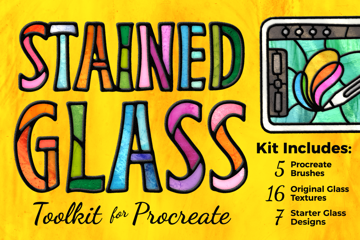 This toolkit comes packed with high-quality design resources like 16 original glass textures that I created by photographing and digitizing pieces of real stained glass, 7 Procreate file starter designs, and Procreate brush set. Learn this new art-making skill in our Stunning Stained Glass course.