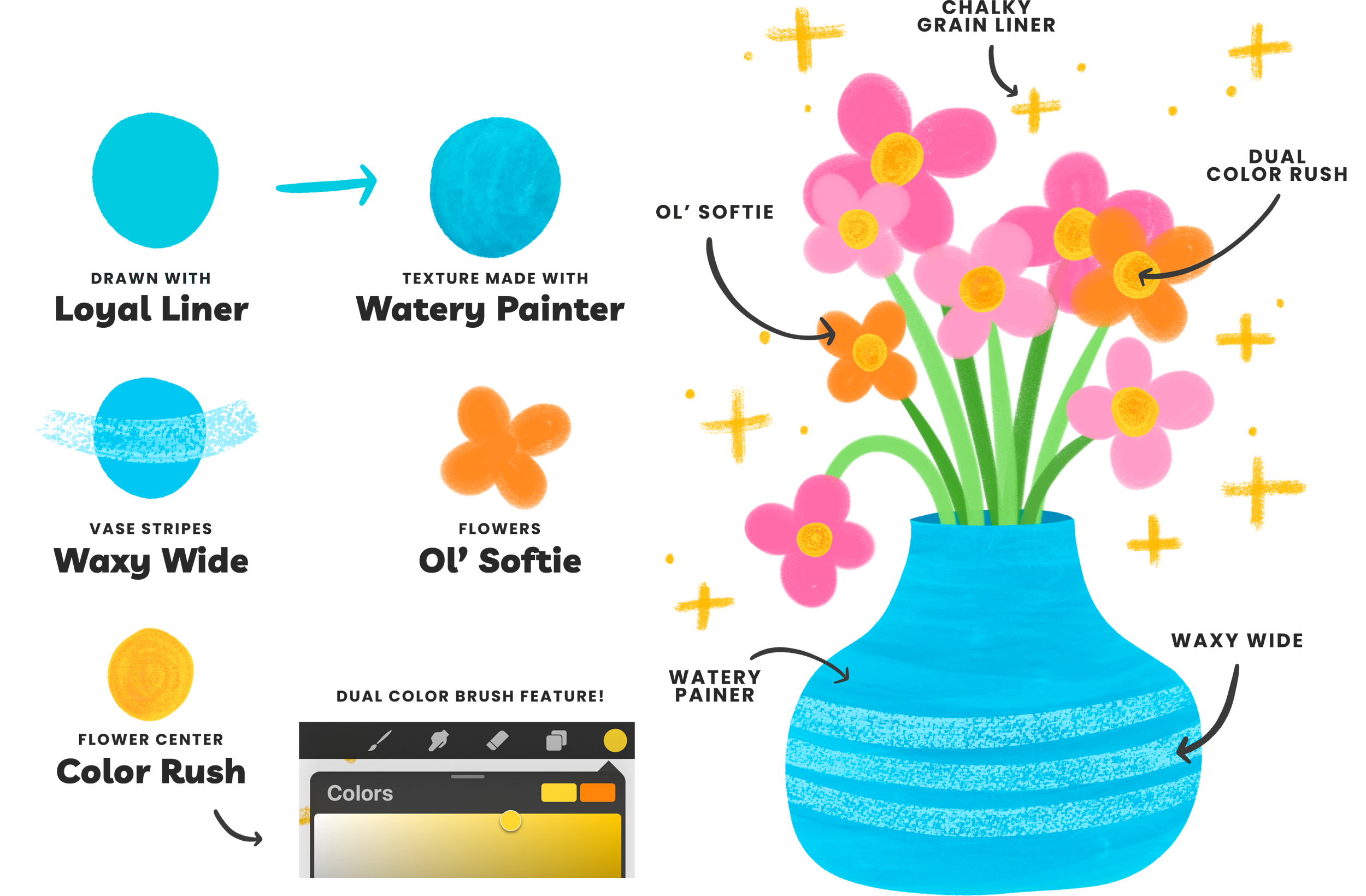 This versatile set of 20 Procreate brushes includes shaders, liners, inkers, and fun painty textures — perfect for illustrating everything from animals to flowers (and everything in between!). Designed to encourage creative exploration and frequently used in club tutorials, this set offers a playful mix for all styles.