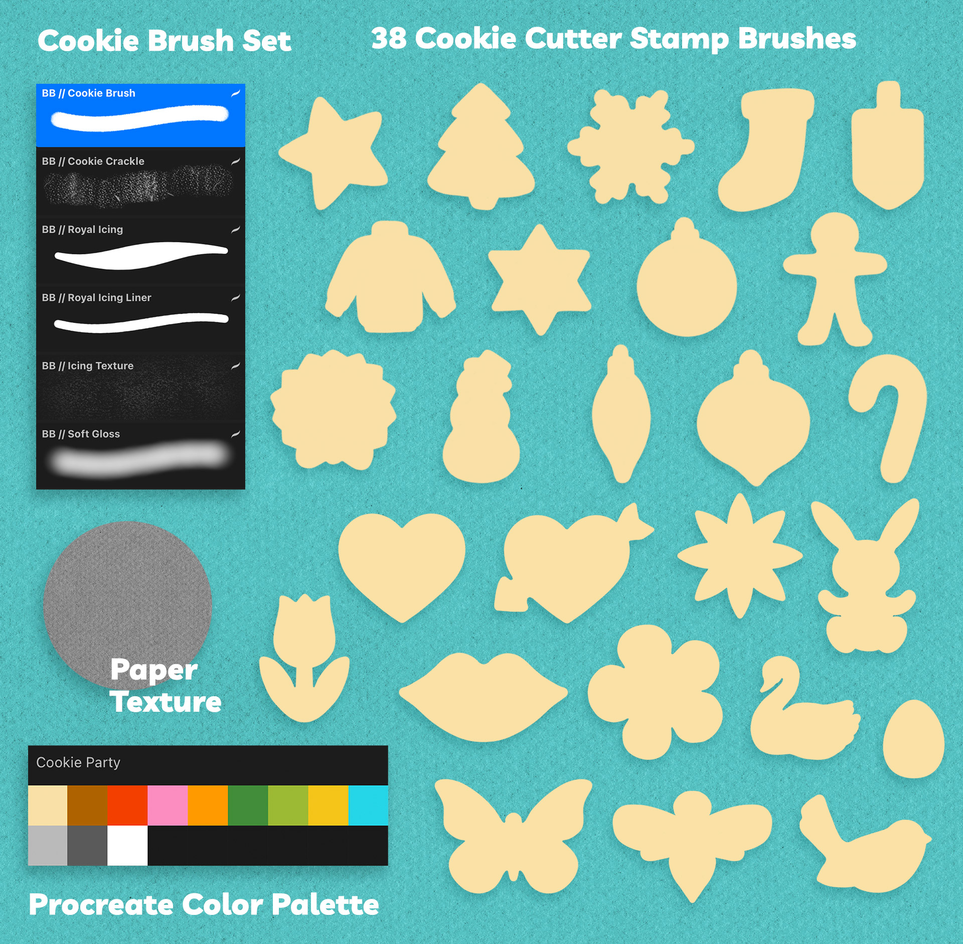 A set of 44 Procreate brushes that are perfect for making and decorating cookies! Comes with 38 "cookie cutter" stamp brushes in various shapes, 2 cookie texture brushes, 2 icing liners, a Soft Gloss shader, and a Cookie Brush - for drawing cookies with a beautiful, textured edge.