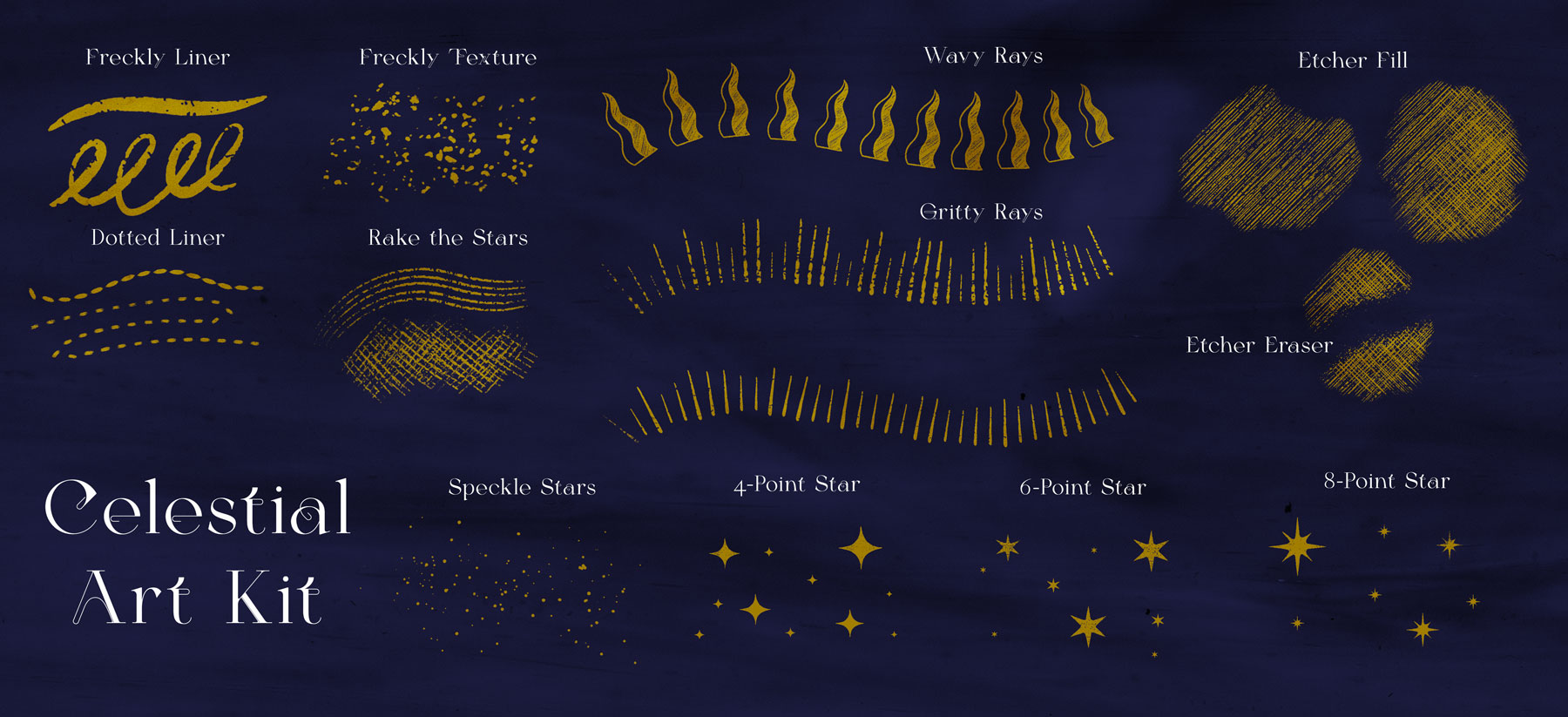 A set of 13 vintage brushes perfect for making engraving-style, celestial-inspired art in Procreate. Learn how to make elegant art with these brushes by taking our Celestial-Inspired Sun Illustration course.