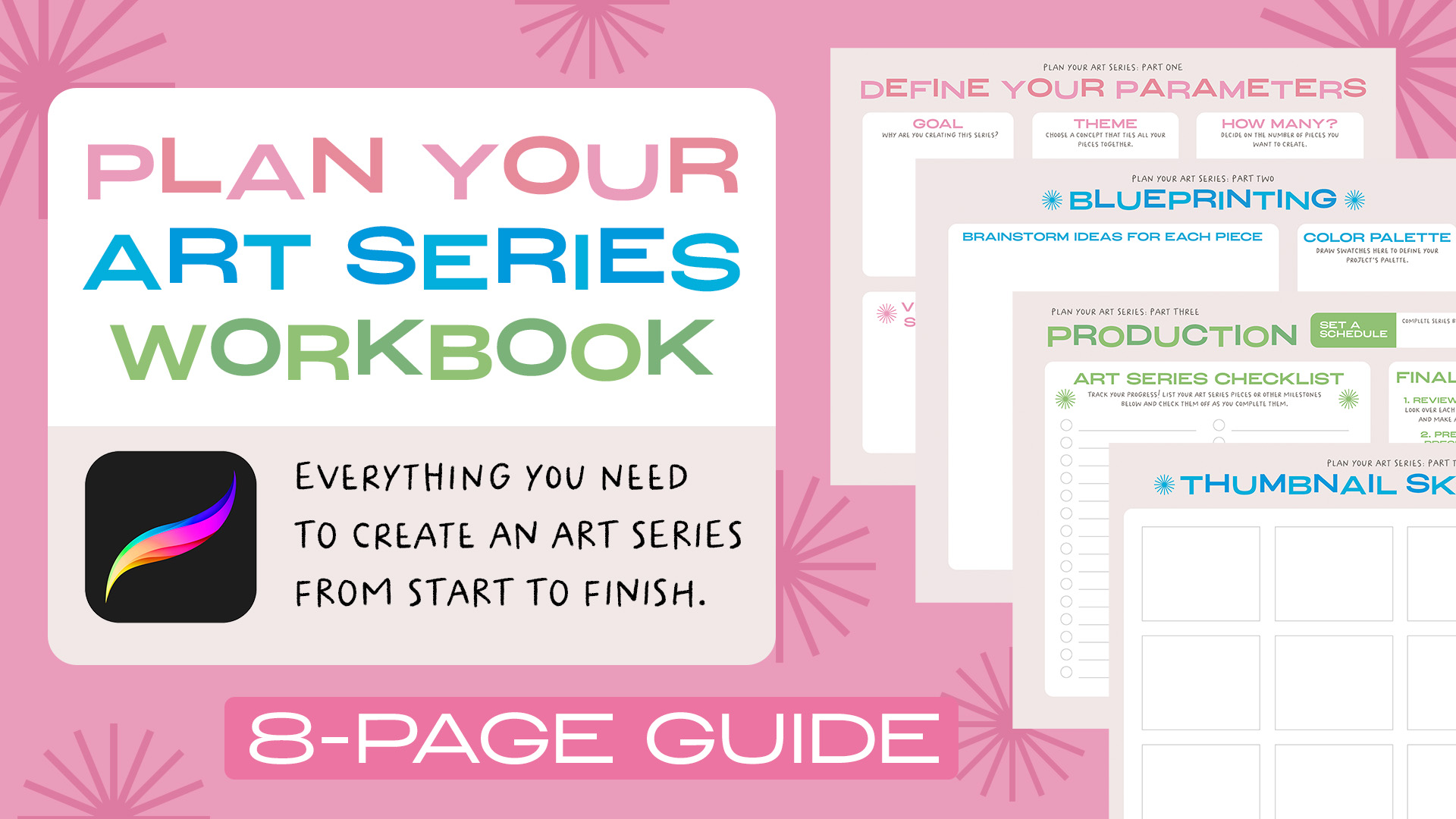 This Art Maker's Club exclusive Procreate file workbook will help you set goals, create a plan of action, and even sketch out your thumbnails, all right in Procreate. It's got everything you need to get your art series started off on the right foot!