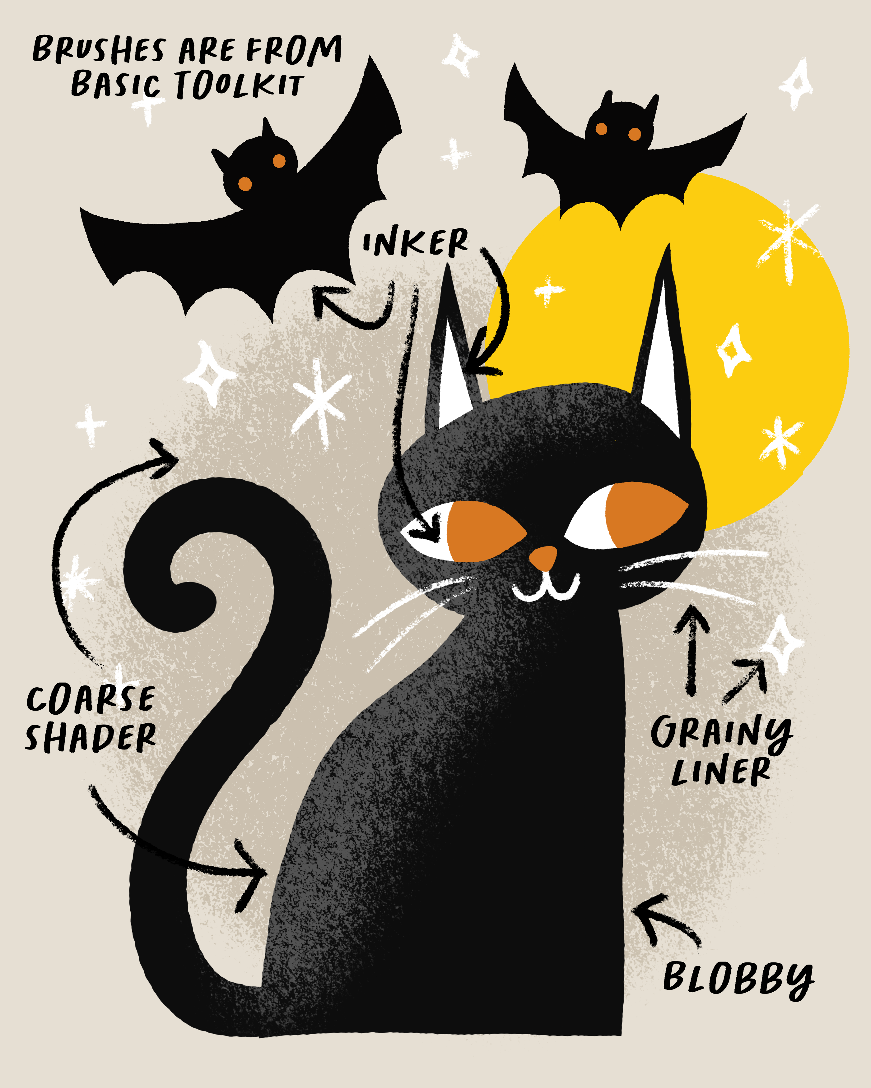 Using brushes from my Updated Basic Toolkit, you'll draw this spooky cat scene! Go wild and get creative by adding your own style and details to this fun illustration!