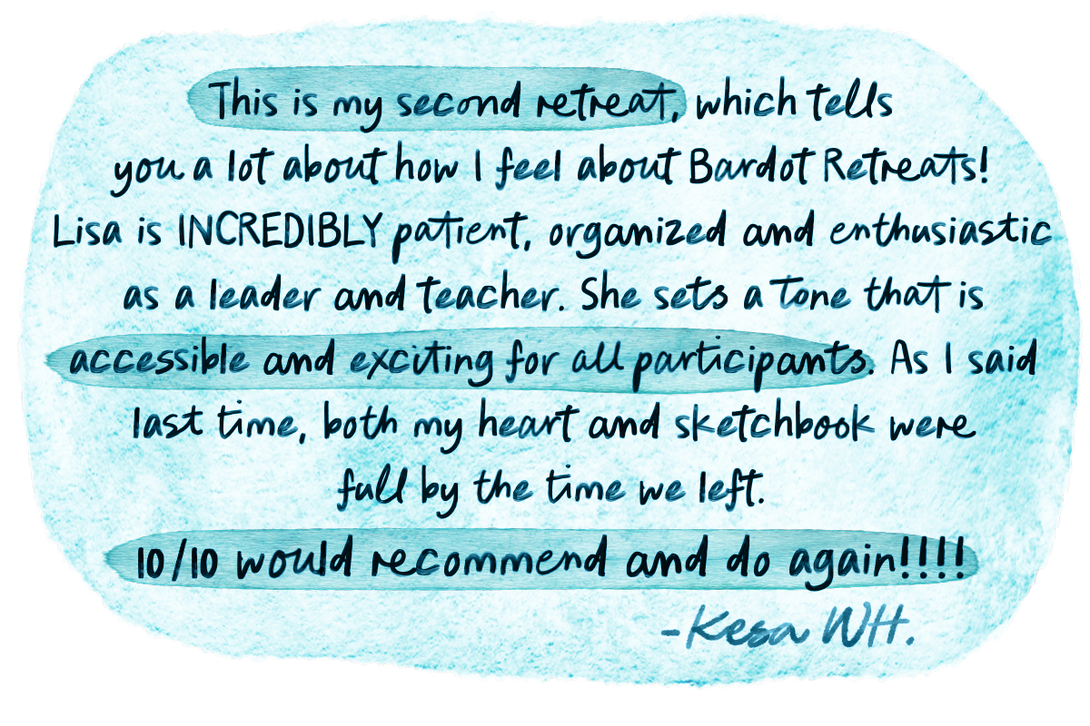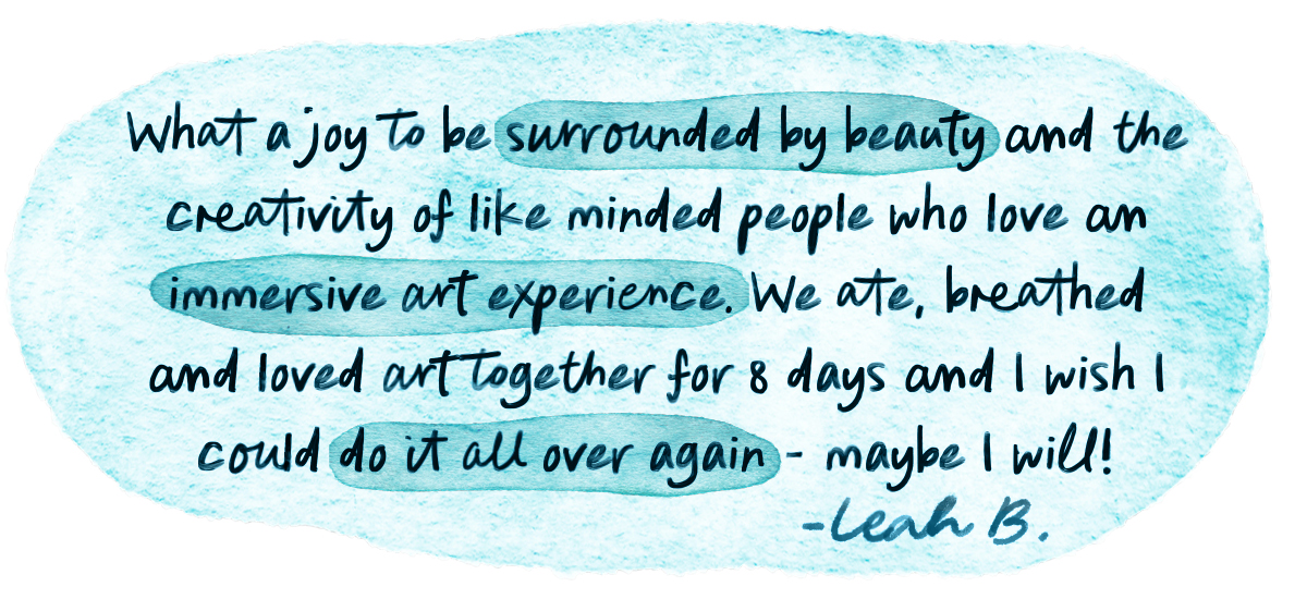 I know everyone left feeling more inspired, more connected to their creativity, and more courageous in their art-making. I saw people step out of their comfort zones, open their sketchbooks in public, and truly see the world with an artist’s eye. I’m so grateful to have shared this retreat with such a warm and wonderful group of people.