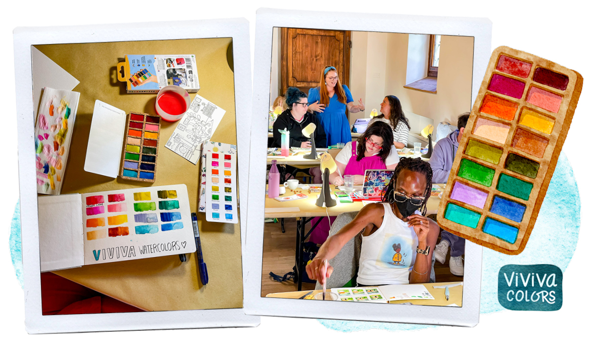 Each day began with a relaxed breakfast together before heading into the studio for our workshops, which focused on both analog and digital watercolor. We started by swatching our palettes and learning how to mix the 16 base colors of the Viviva set into any shade imaginable.
