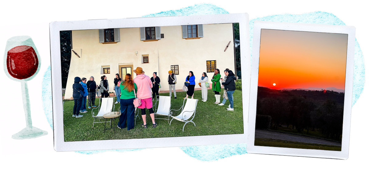 Our home base was Tenuta di Sticciano, nestled in the beautiful Tuscan countryside. The grounds were dreamy—vineyards, olive groves, and the kind of sunsets that make you stop and just take it all in. We wandered the property, lunched under tall trees, and settled into the rhythm of making art together in one of the most beautiful places on earth.