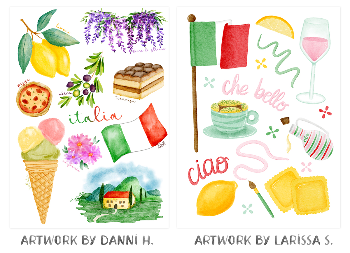 Our second project was a travel-inspired collection—a composition of mini illustrations based on what we saw, tasted, and experienced during the retreat. Everyone’s work was deeply personal and full of charm: wine bottles, pastries, rustic shutters, blooming flowers, rolling hills. Each piece told a little story.