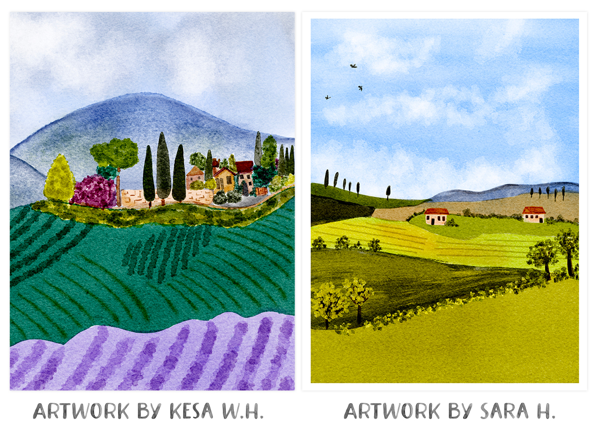 Throughout the retreat, we focused on two main projects. The first was a Tuscan landscape painting in digital watercolor, inspired by the gorgeous setting of the retreat. We warmed up by painting mini landscapes in our sketchbooks.