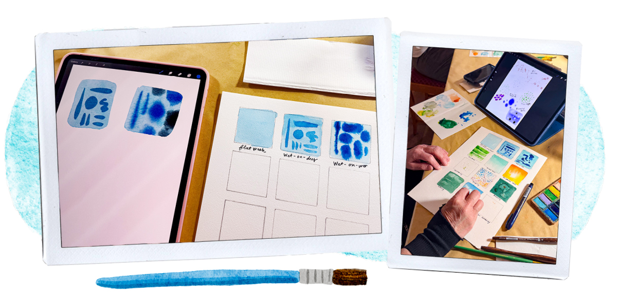 One of my favorite lessons—a side-by-side exploration of watercolor techniques like wet-into-wet, dry brush, and layered washes, practiced both on paper and in Procreate. Watching everyone discover how the two mediums could inform and enhance each other was such a delight.
