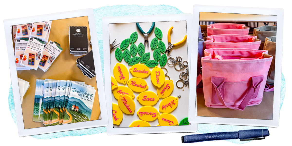 One of my favorite parts of hosting a retreat is creating thoughtful welcome bags, and this year’s might have been my favorite yet. Each attendee received a travel-friendly art kit designed to help them travel like an artist. Inside were vibrant Viviva Colors watercolor sets, sketchpads (generously provided by Viviva!), prints, stickers, a retreat booklet, and a roomy tote to carry it all around Tuscany. I even designed and 3D printed lemon-shaped name tags for each person. It brought me so much joy to see everyone using their kits all week long.