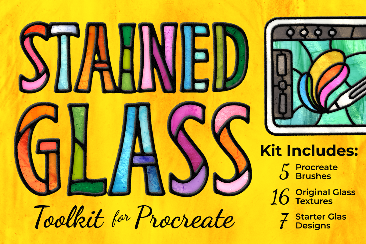 This toolkit comes packed with high-quality design resources like 16 original glass textures that I created by photographing and digitizing pieces of real stained glass, 7 Procreate file starter designs, and Procreate brush set. Learn this new art-making skill in our Stunning Stained Glass course.