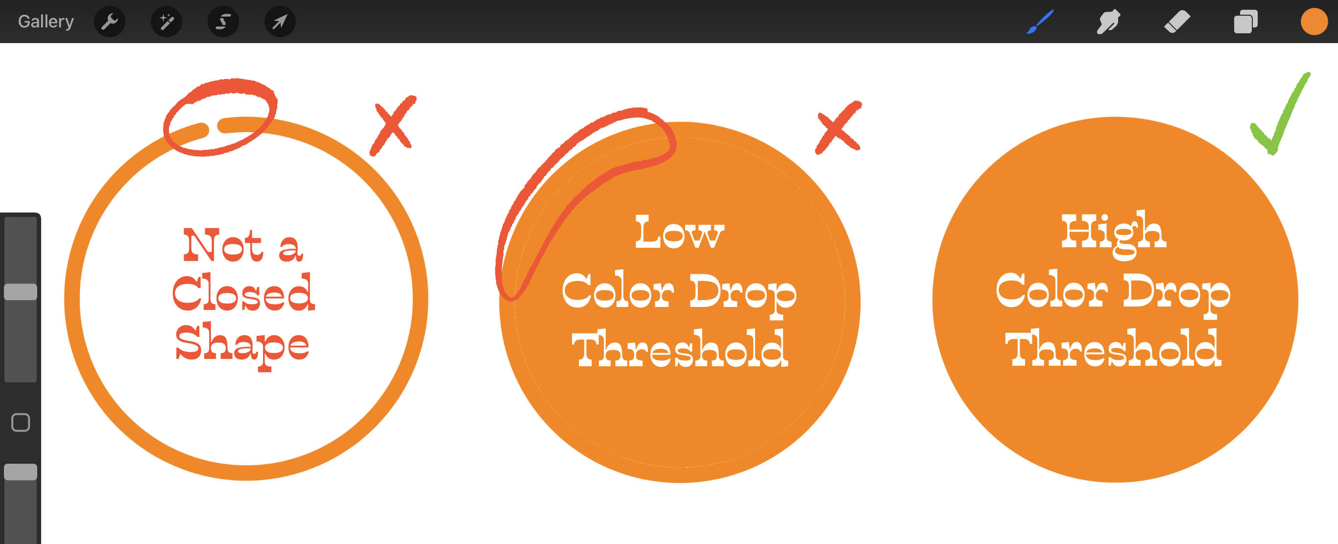 If your entire canvas floods with color, or you see a white gap in your shape, you need to adjust your Color Drop Threshold. Here's how to adjust it: