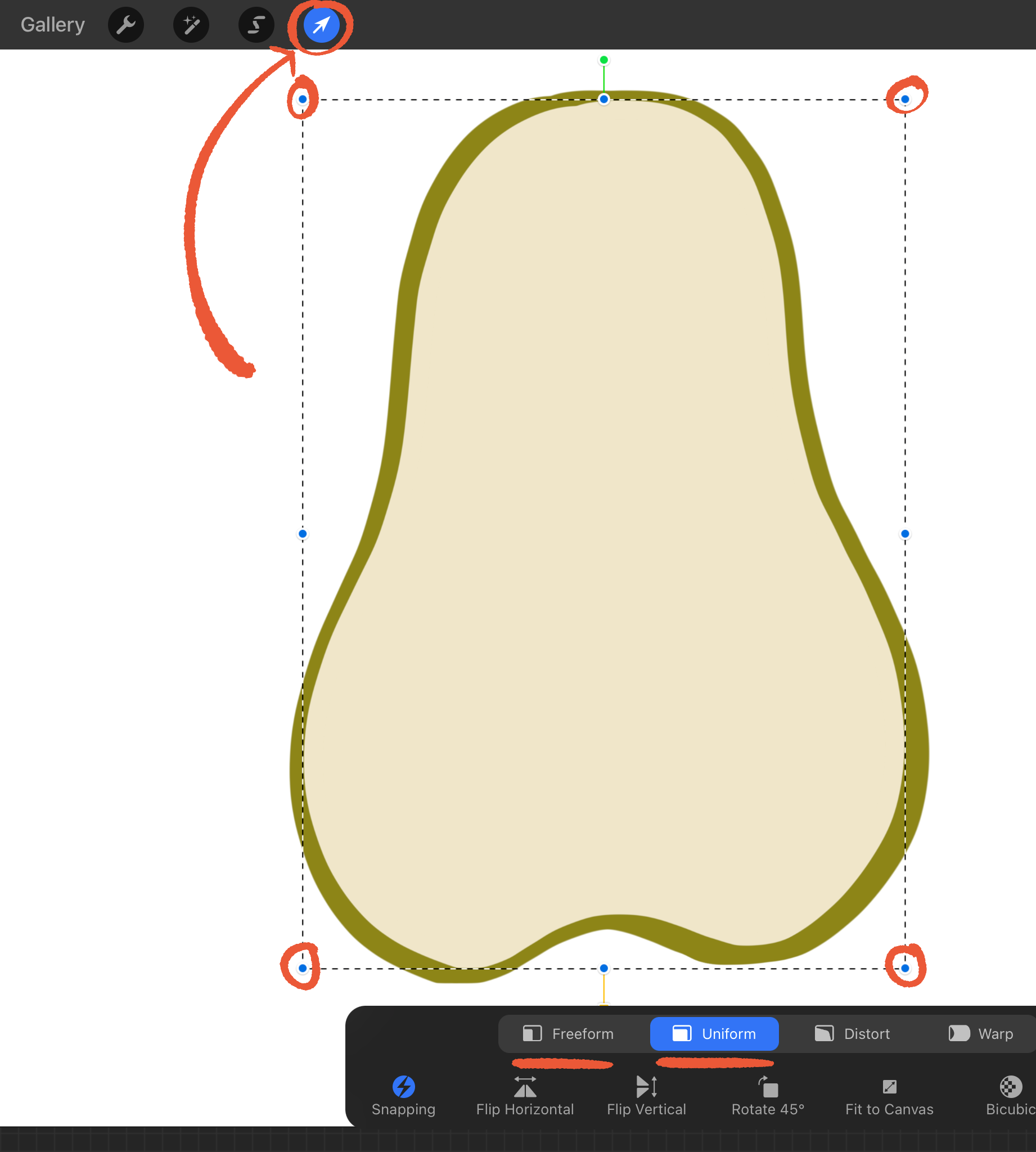 The transform tool allows you to move things around your canvas (as well as flip, distort, and warp!) Here's how to make a uniform transformation that keeps your artwork in proportion: